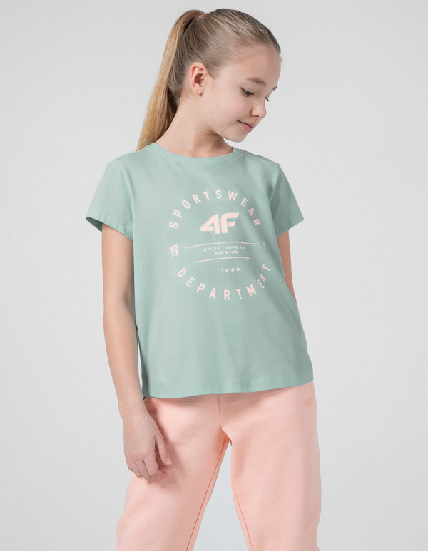 Dziewczęca koszulka sportowa posiada elastyczne włókna w technologii 4FDry, dzięki czemu wspiera odprowadzanie wilgoci podczas sportowych aktywności.