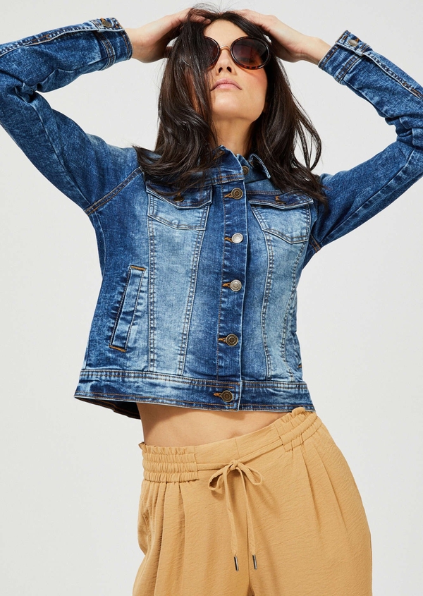 71%BAWEŁNA, 14%POLIESTER, 14%WISKOZA, 2%ELASTAN Niebieska, cieniowana kurtka jeansowa ze stebnowaniami żółtą nitką. Krótki fason, długość do pasa. Zapinana na guziki. Klasyczny kołnierzyk. Katana posiada 4 kieszenie: dwie po bokach i dwie piersiowe. Długie rękawy z mankietami. Stylowa kurtka jeansowa wpisująca się w aktualne trendy. Moodo.pl