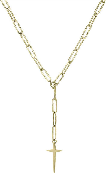 Naszyjnik damski wykonany z łańcucha o płaskich zdobionych prostokątnych ogniwach z krzyżem o satynowym wykończeniu. Dyskretny federing umożliwiający zapięcie łańcucha w dowolnym miejscu. Naszyjnik wykonany z hipoalergicznej stali szlachetnej, pozłacanej trwałą metodą PVD, który nadaje biżuterii trwały i piękny kolor. Pasuje do każdej stylizacji, zarówno tej do biura, jak i na elegancką kolację. Naszyjnik z pewnością posłuży nie jeden sezon.