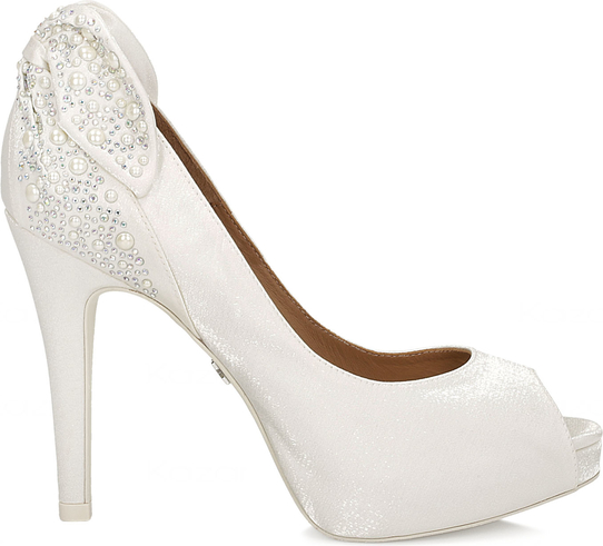 Białe czółenka peep toe wykonane z wysokiej jakości satyny, zostały stworzone na wyjątkową okazję. Błyszczące kryształki mienią się i połyskują na pięknej kokardce umieszczonej na zapiętku. Buty pokryte niezwykle delikatną i subtelną tkaniną, która w zależności od kąta patrzenia, delikatnie zmienia kolor i intensywność połysku.