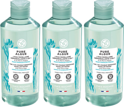 Zestaw trzech takich samych Płynów micelarnych to ekonomiczna opcja na zakup produktów codziennego użytku. Kosmetyki, nie tylko wystarczą na długo, ale również sprawdzą się idealnie dla osób, które chcą mieć swoich ulubieńców zawsze przy sobie.Po użyciu Płynu micelarnego „2w1” z mikroalgą Pure Algue skóra jest doskonale oczyszczona, nawilżona oraz bardziej napięta. Naturalny skład płynu micelarnego to przepis na kosmetyk idealny!Płyny micelarne „2w1” z mikroalgą Pure Algue – korzyści:• skutecznie zmywa nawet trwały makijaż twarzy i oczu,• oczyszcza skórę z zanieczyszczeń oraz ją nawilża,• sprawia, że skóra staje się bardziej promienna,• jego ultraodświeżająca formuła pozostawia skórę czystą, przyjemnie miękką i z uczuciem świeżości,• ze względu na naturalny skład respektuje pH skóry,• jego butelka jest wykonana w 100% z plastiku odzyskanego w procesie recyklingu